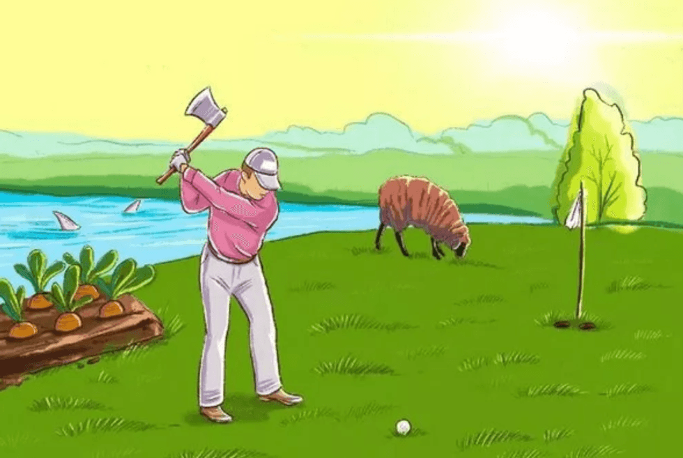 Pastaj, fillojnë të shfaqen disa nga "gabimet", siç është burri që lëkund një sëpatë në vend të një shkopi golfi dhe dy peshkaqenë që notojnë në liqenin pas tij.