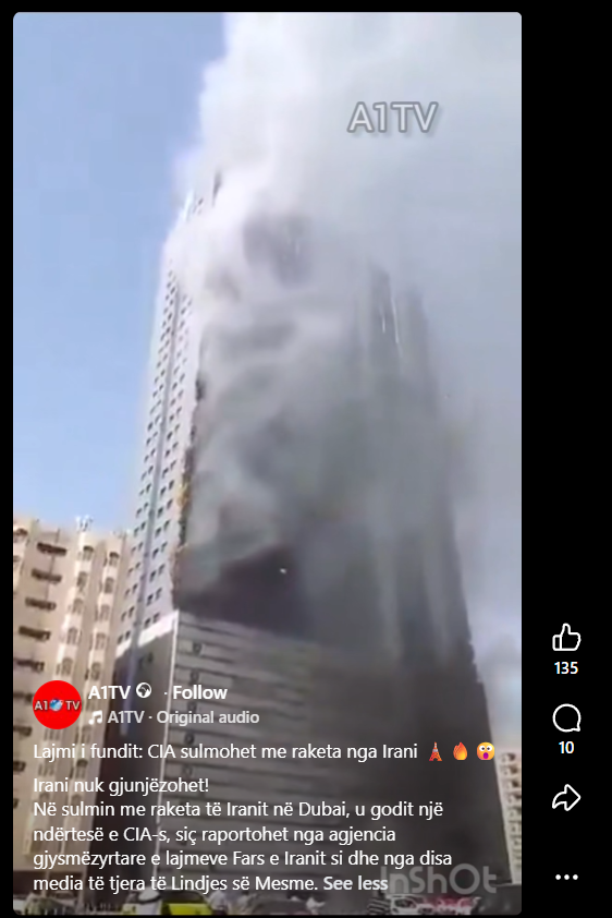 Që nga sulmi i përbashkët i ShBA dhe Izraelit ndaj Iranit, i cili filloi më 28 shkurt 2026, Irani është përgjigjur me kundërsulme ndaj objektivave në rajonin e Gjirit Persik. Raketat kanë rënë edhe në Dubai. Në rrjete sociale, përfshi ato shqipfolëse, po qarkullon një video që pretendohet se tregon një godinë të Agjencisë Qendrore amerikane të Inteligjencës (CIA) në Dubai të goditur nga këto raketa.
