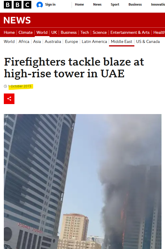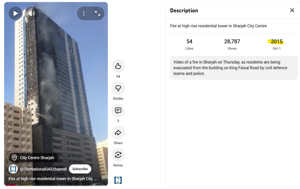 Një video e ngjashme e kësaj ndërtese në flakë u postua më 1 tetor 2015, në YouTube nga media e Emirateve të Bashkuara Arabe, The National. Përshkrimi i videos thotë se një zjarr shpërtheu në Sharjah, në një kullë banimi në Rrugën King Faisal.