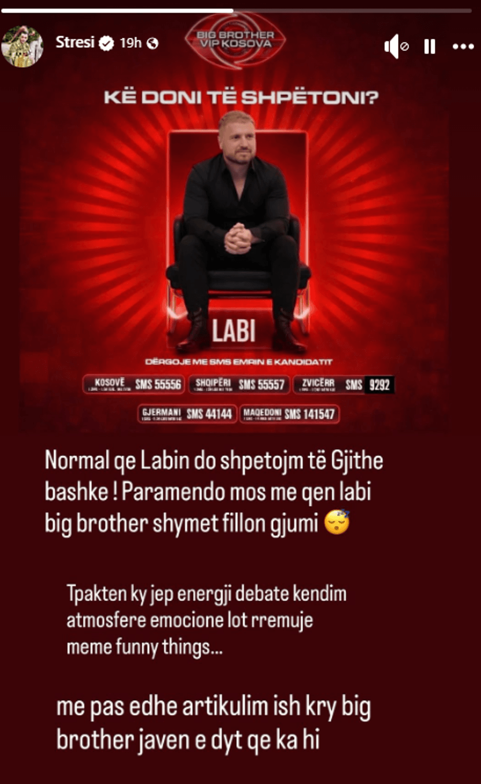 Përmes një postimi, Stresi u ka bërë thirrje ndjekësve që të votojnë për Labin, duke theksuar se prania e tij i jep energji lojës dhe mban gjallë debatin dhe emocionin brenda shtëpisë.