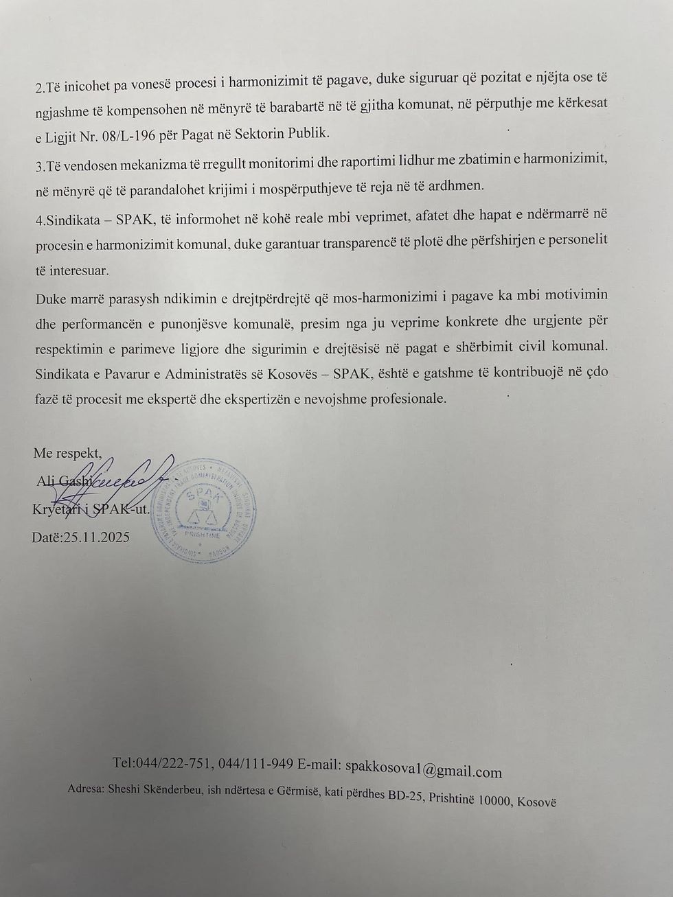 Sindikata e Pavarur e Administratës së Kosovës (SPAK) u ka dërguar një kërkesë zyrtare të gjithë kryetarëve të komunave të vendit, duke kërkuar harmonizimin e vendeve të punës dhe pagave brenda shërbimit civil komunal, në përputhje me Ligjin për Pagat në Sektorin Publik.