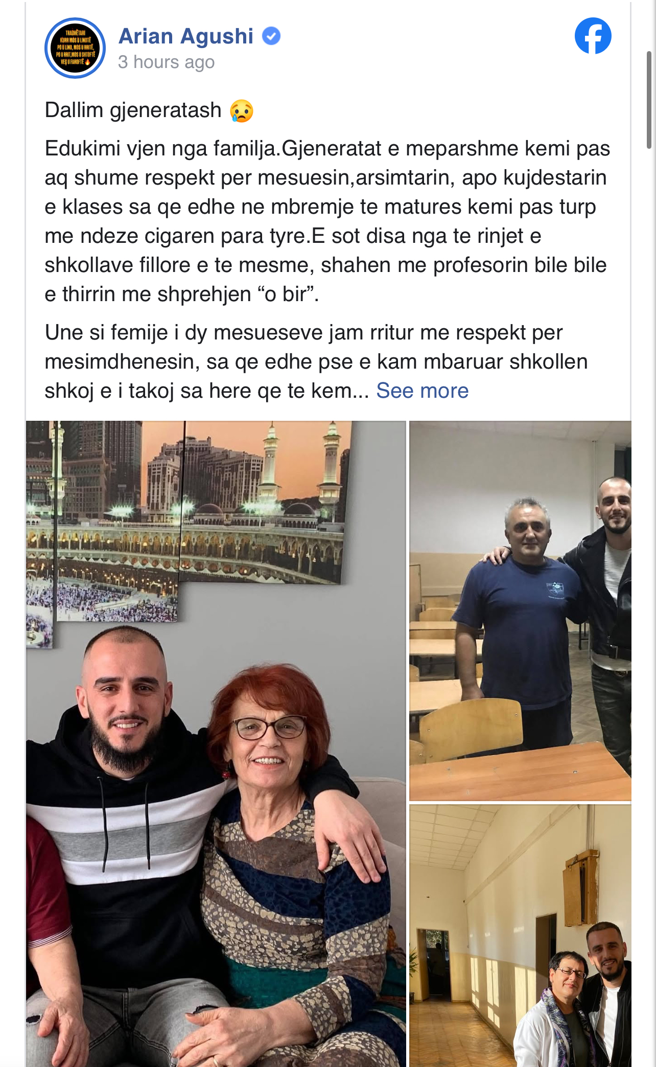 Edukimi vjen nga familja.Gjeneratat e meparshme kemi pas aq shume respekt per mesuesin,arsimtarin, apo kujdestarin e klases sa qe edhe ne mbremje te matures kemi pas turp me ndeze cigaren para tyre.