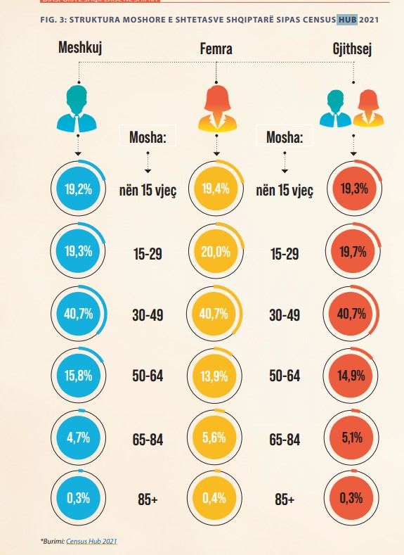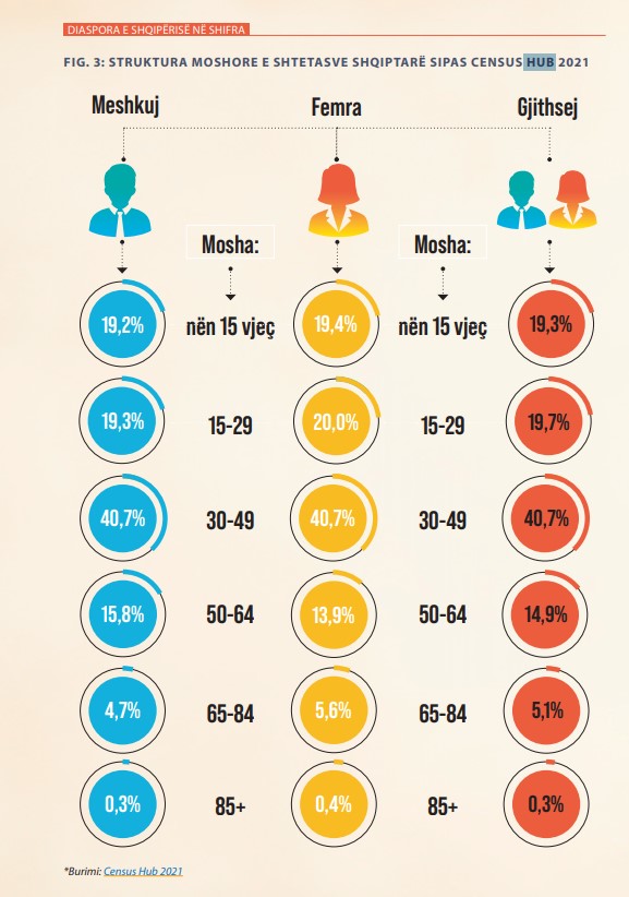 Sipas të dhënave të fundit nga Cens Hub emigrimi në dekadën e fundit shënonte 56 % meshkuj në Gjermani, 53 % në Greqi dhe 51 % meshkuj në Itali. Shtetas shqiptarë që jetojnë në Evropë figurojnë të jenë të një moshe të re, edhe në raport me strukturën e popullssisë së vendeve pritëse.