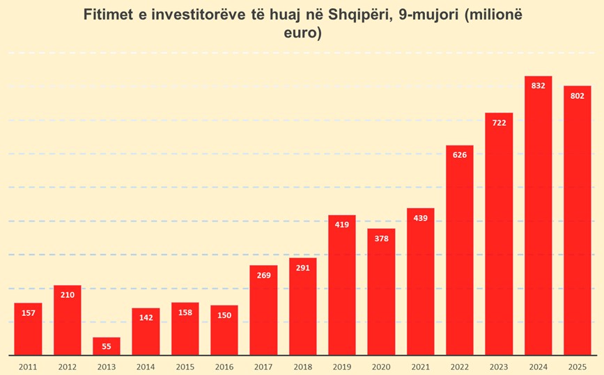 Të dhënat progresive tregojnë se, edhe për vitin 2025, investimet e huaja direkte vazhdojnë të regjistrojnë nivelet më të larta historike. Për 9-mujorin, vlera e investimeve të huaja direkte arriti në 1.208 miliardë euro, shifër kjo 4.4% më e lartë krahasuar me të njëjtën periudhë të një viti më parë.