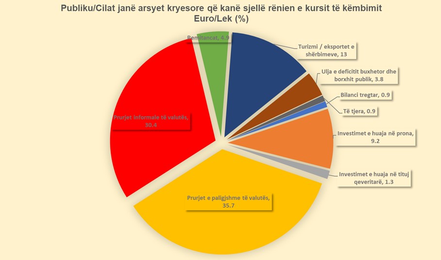 Sipas përgjigjeve të sondazhit, në pjesën më të madhe pjesëmarrësit mendojnë se faktorët kryesorë që kanë sjellë rënien e kursit të Euros janë prurjet e paligjshme të valutës, me 36% të përgjigjeve dhe prurjet informale, me 30% të tyre.