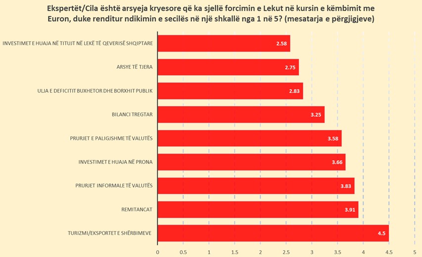Mbështetur në përgjigjet e tyre, faktori me peshën mesatare më të lartë në vijimësinë e rënies së kursit të këmbimit Euro-Lek ka qenë turizmi dhe në përgjithësi rritja e eksporteve të shërbimeve në ekonominë shqiptare. Paneli i ekspertëve e ka vlerësuar këtë faktor me një ndikim 4.5 (nga një shkallë maksimale 5).